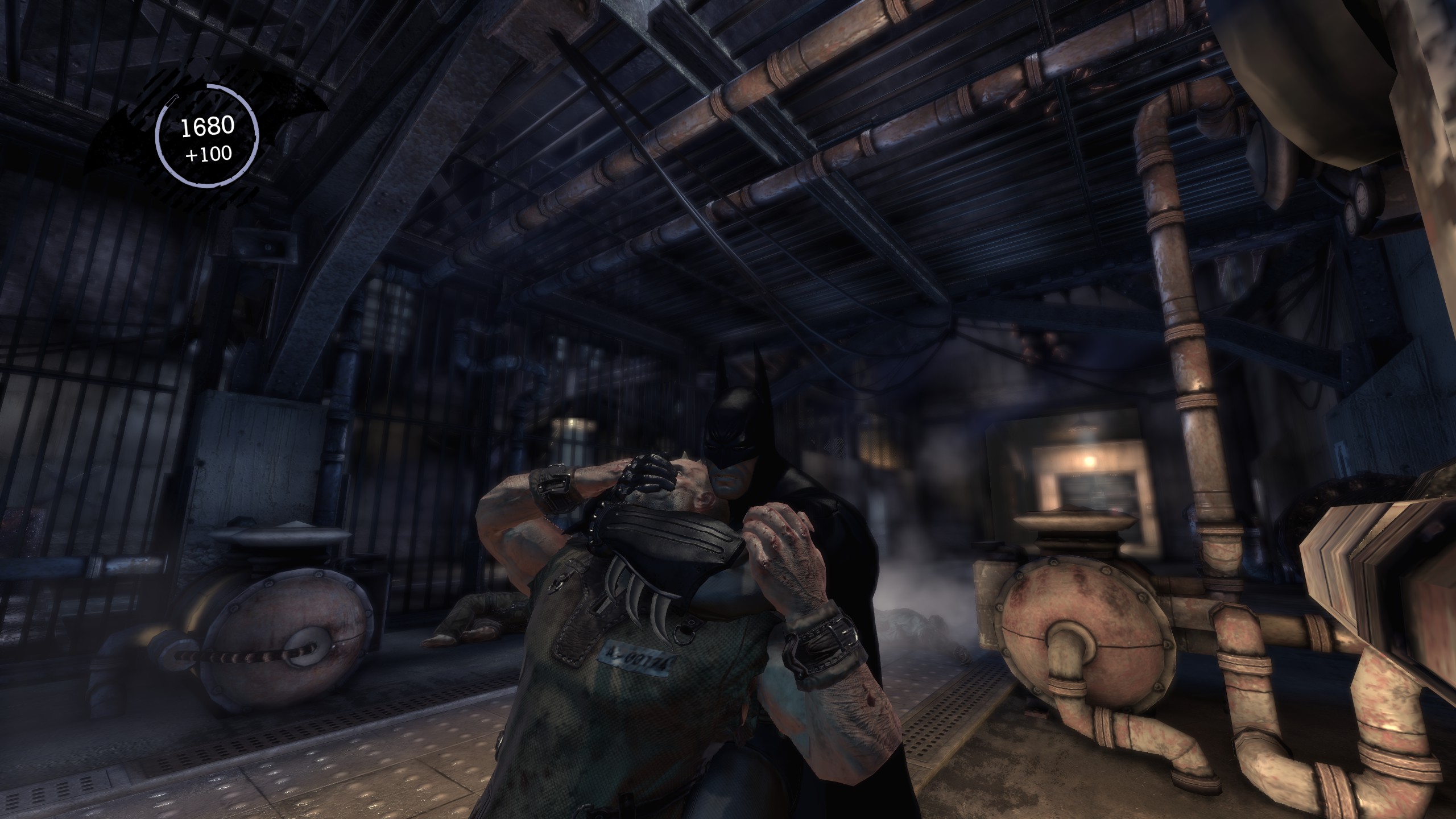 Your speed and strength increase as your hit combo increases. The combat is free-form, in a sense that you begin by punching a dude in the face, then angling the stick in the direction of another dude and punching him in the face, and repeating this for each guy surrounding you. The animation of Batman drifting from man to man, beating the shit out of everyone, is always seamless and impressive. As you continue to strike dudes, Batman gets faster and faster. If a guy attempts to attack you, there will be little lightning bolts above his head, and you will press the Counter button quickly, where Batman will then catch the punch and beat the dude to the ground. It’s smooth, quick and brutal. It’s very satisfying when you take out a gang of 10 or more guys without taking a single hit, moving between strikes like a ballet dancer in a dress made of recycled Firestone tires. I love the combat in Batman: Arkham Asylum. But I’ve only talked about fighting in the first couple of hours. Just when you think it’s starting to get repetitive, Rocksteady changes it up.